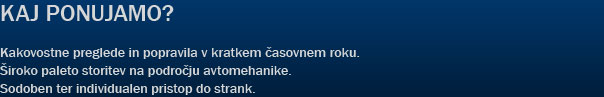 Na 120 kvadratnih metrih avtomehanične delavnice nudimo različne vrste popravil, podprte s sodobno opremo, stroji in orodji. Poleg rednih servisov in pregledov vozil nudimo tudi menjavo in centriranje pnevmatik, menjavo in popravilo klimatskih naprav, pregled in popravilo zavornih sistemov ter še veliko več.